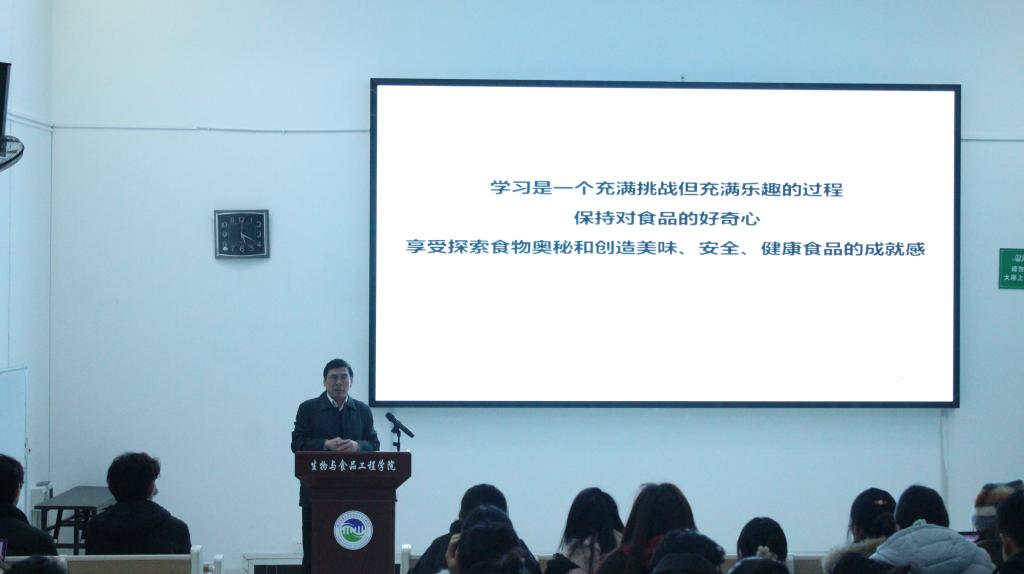 潘思轶教授围绕食品学科建设、人才培养体系及学生发展规划等主题展开了深入分享,从专业内涵到个人成长,多维解读食品人的使命与未来,为学院发展与学生成长提供了前瞻性的思路与切实可行的建议。潘思轶教授以“四个认识”为主线,系统梳理了大学生成长路径:从“认识你的大学”中理解教育使命与个人定位,从“认识你的学院”中把握学科平台与发展资源,从“认识你的专业”中洞察食品科学的多学科交叉特性与前沿动向,从“认识你自己”中明晰职业规划与成长方向。