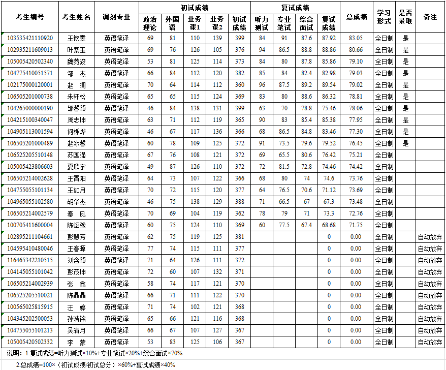 雷竞技raybet登录入口外国语学院2025年硕士研究生调剂考生成绩及拟录取情况公示--英语笔译