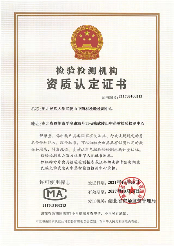 10月25日,湖北省市场监督管理局为中心颁发了“检验检测机构资质认定书”。中心的投用,将促进恩施州乃至武陵山地区生物医药产业的发展,也将推进学校中医中药、生物制药、制药工程等专业的产学研融合与提档升级。