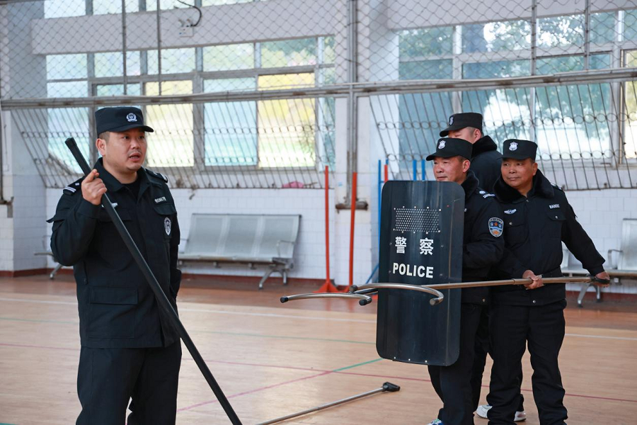 恩施市公安局特警大队副大队长梅恋寒、特警队员王苗在室内篮球馆详细讲解了防刺服、警棍、防暴盾、钢叉等常用安保器械的使用方法、动作要领及注意事项,并做了标准的使用演示,指导安保人员进行了三人、四人为攻防小组的防暴演练。为强化培训成果,在校大门组织安保人员进行了现场模拟实操演练。