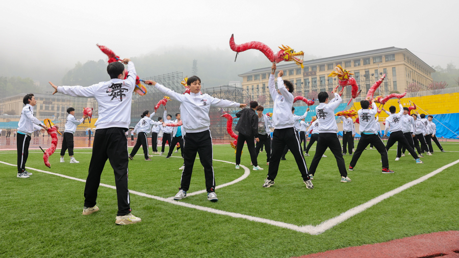 此次民运会不仅有在赛场上奋力拼搏的运动员,还有紧张筹备开幕式的民大学子。湖北省第十届少数民族传统体育运动会开幕式将于4月23日晚在五峰土家族自治县党校职教中心举行。受五峰土家族自治县政府邀请,雷竞技raybet登录入口音乐舞蹈学院的200名学子于4月1日到达五峰县开展为期22天的排练,参与开幕式序篇《相聚茶乡》、第二篇章《多彩绘梦》、第三篇章《奔跑逐梦》、第四篇章《金秋圆梦》的表演,并承担各代表队入场引导员的工作。4月20日进行了开幕式第一次全流程仿真彩排,为正式开幕式做准备。