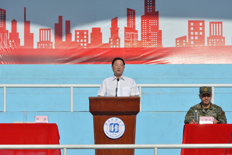 上午8时30分,在雄壮的国歌声中,军训动员大会正式开始。邓磊为军训团授旗。邓磊在动员讲话中代表学校向承担此次军训任务的恩施州武警支队领导、教官表示崇高的敬意和衷心的感谢。他指出,大学生军训是大学教育的第一课,是国防教育的必修课,是中共中央国务院中央军委联合下文安排部署的政治大课。邓磊对同学们提出三点希望和要求:一是要培养国防意识。希望同学们增强忧患意识,居安思危,为国防教育与建设贡献青春力量。二要增强纪律观念。希望同学们以军人的身份严格要求自己,遵守军训纪律,自觉服从教官命令、听从教官指挥,学习军人不怕吃苦、纪律严明、拼搏奋进的精神。三是要磨练坚强意志。希望同学们严格要求,刻苦训练,主动磨炼顽强意志,掌握必备军事技能,培养吃苦耐劳的意志品质。最后,邓磊发布军事命令,宣布为期7天的军训正式开始。