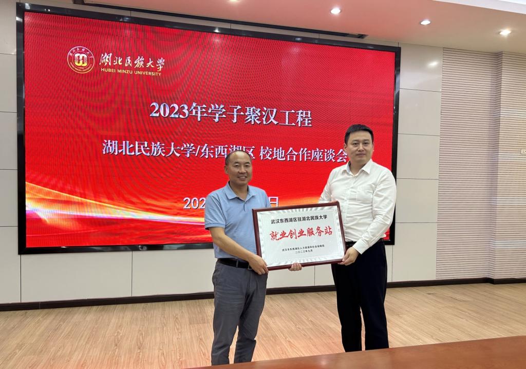 叶志文进行了东西湖区域推介及人才政策推介,他表示欢迎五湖四海的人才到东西湖区生根发芽,发光发热,实现合作共赢,让东西湖区成为滋养人才的沃土。学校招生就业与校友联络处处长向政介绍了学校基本情况。他表示学校一直致力于为地区发展建设培育高素质人才,武汉东西湖区与学校的对接活动将为学生提供大量就业岗位,进一步推动毕业生高质量就业。双方随后举行了“武汉市东西湖区驻雷竞技raybet登录入口就业创业服务站”授牌仪式。