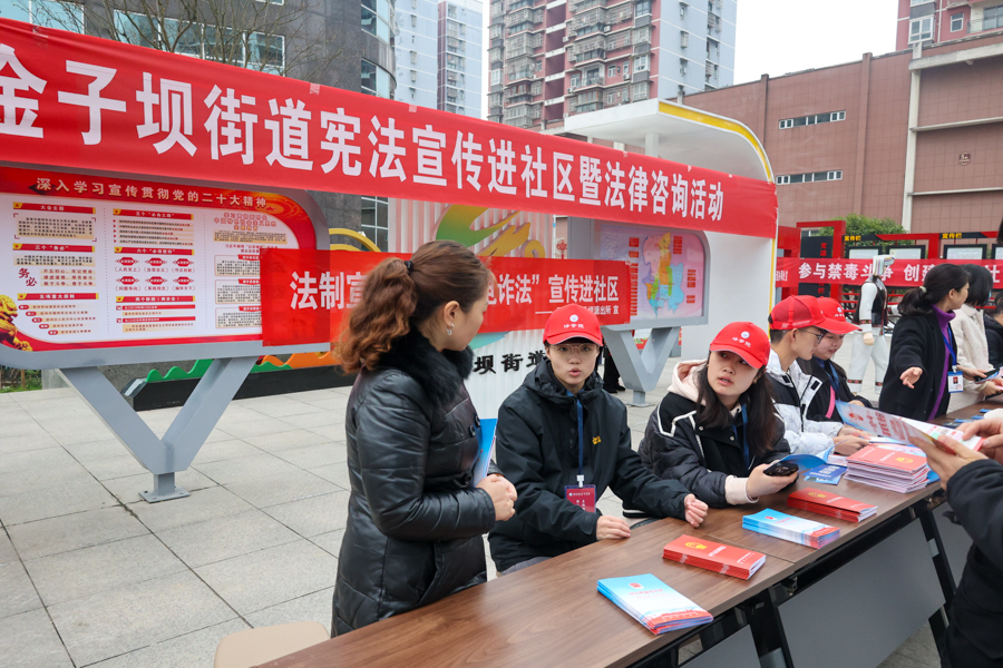 下午,法学院联合恩施市舞阳坝街道办事处栖凤社区、恩施市舞阳坝派出所,在舞阳中学开展了以“走进宪法,携手成长”为主题的宪法宣传活动。活动中,舞阳中学师生们齐声朗读《中华人民共和国宪法》的部分节选内容,引导学生们更深入地理解宪法的基本原则和核心价值。法学院李建忠博士紧扣主题《学宪法 讲宪法》,对宪法的基本概念、原则、重要地位进行了深入浅出的讲解,引导学生们从自身角度理解宪法的意义和价值。法学院司马俊莲教授带队的“同心服务团”,联合中国民主同盟恩施土家族苗族自治州委员会、恩施州人民检察院到恩施市小渡船办事处大观园社区举办了法治进社区普法活动。