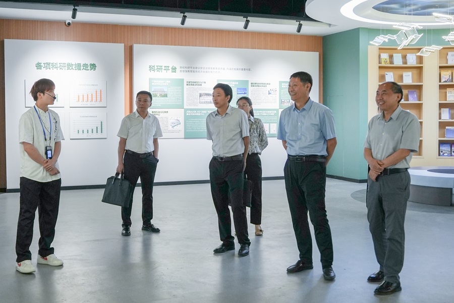 余涛一行参观了学校展览中心,通过考察校史陈列厅、办学成果展示厅和发展规划厅,详细了解了学校的发展历程、人才培养、科学研究与社会服务、文化传承及发展规划等方面的基本情况。