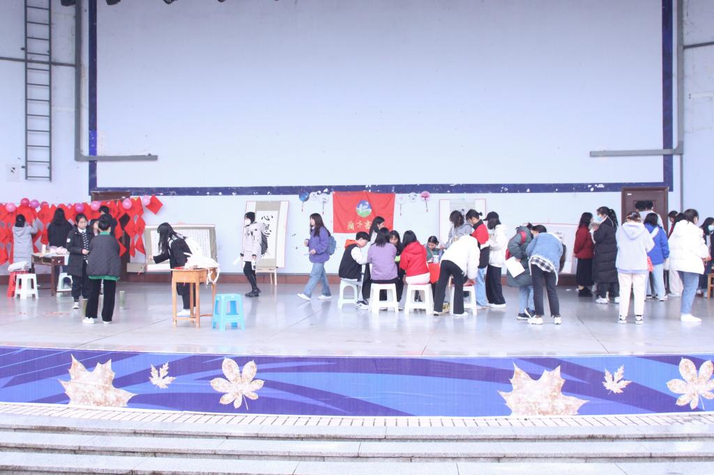 “书法知识竞答”环节,学生对五道书法知识题目进行作答,题目涉及书法发展史、诗词理解、基本常识等内容,学生积极回忆所学书法知识,或冥思苦想,或对答如流,充分感受中华书画文化的博大精深和独特魅力;“福倒了”环节,学生执笔挥斥,用笔画勾勒中华汉字的博大精深,整个过程一气呵成,彰显学生的书法艺术修养和高超技艺;“雅歌投壶”环节,学生聚精凝神,手脑并用,一边吟诗一边投壶,充分考验其协调能力,让学生在温习古诗词的同时体验投壶的乐趣;“寄愿祈福”环节,学生在便利贴上写下新春祝愿,一言一语尽显真切情感,字字充斥着对春节的美好希冀,吸引众多学生驻足观看。