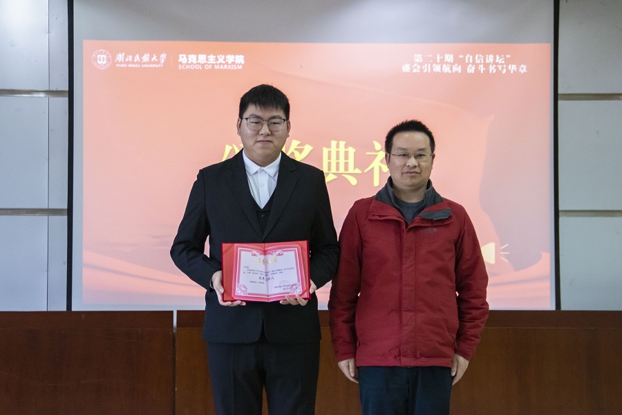 11月16日,马克思主义学院在德智楼三楼多功能汇报厅举办以“盛会引领航向,奋斗书写华章”为主题的第二十期自信讲坛活动。恩施州委宣传部,学校党委宣传部、马克思主义学院等单位领导受邀参加活动,各二级学院学生会主席团成员、马克思主义学院大一大二学生到场聆听。中国共产主义青年团第十九次全国代表大会代表田金爽担任主讲人。