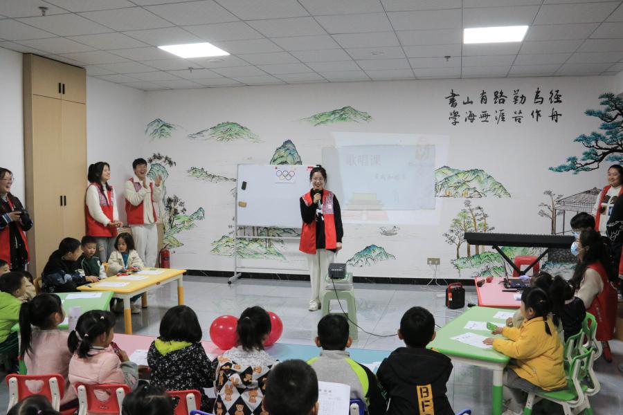 本次活动设有《演讲与口才》和《音乐教育》两个课程。志愿者赵崇敏担任《演讲与口才》课程主讲人,她亲切讲教、生动比划,结合教学视频教授口部操,在场小朋友全神贯注倾听学习,并通过练习绕口令《白石塔》检验学习成果。课程最后,小朋友合诵《少年中国说》,声音洪亮、抑扬顿挫,收获阵阵掌声。志愿者刘墨存担任《音乐教育》课程主讲人,她以钢琴曲《我和你》引入本次课程的主题“奥林匹克”,并邀请小朋友上台在画板上听歌绘画,随后,她对奥运五环的释义进行讲解,并带领小朋友学习歌曲《我和你》,加深小朋友对奥运的理解。