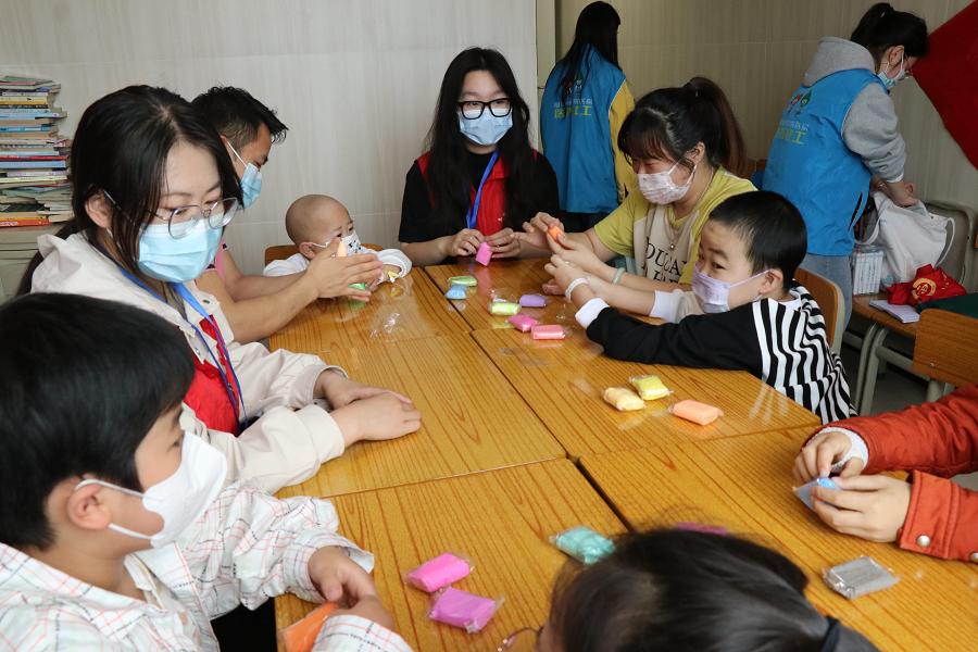活动现场布置桌椅、图书、绘本、玩具若干,志愿者带领小朋友在医院特设爱心教室内一对一交流互动,进行多样有趣的“捏彩泥”“绘图画”等活动。