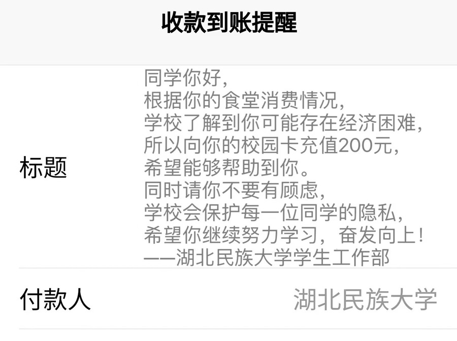 “根据你的食堂消费情况,学校了解到你可能存在经济困难,所以向你的校园卡充值200元,希望能够帮助到你……”12月18日,雷竞技raybet登录入口不少在校学生突然收到了这样一条短信。大家一开始感到十分意外,以为是诈骗短信,经过向老师核实,才确认这原来是学校对同学们默默的暖心行动——为保障大学生合理营养用餐所发放的暖冬餐补。“暖冬餐补”短信“本次收到餐补的学生共计120余人,每人发放200元。确认人选后不公布名单,而是悄悄...
