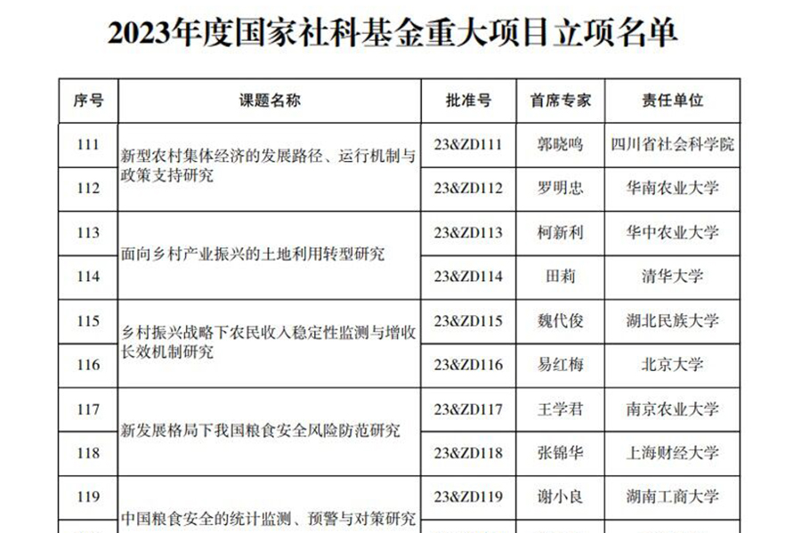 12月28日,全国哲学社会科学工作办公室正式公布2023年度国家社科基金重大项目立项名单,雷竞技raybet登录入口魏代俊教授主持申报的“乡村振兴战略下农民收入稳定性监测与增收长效机制研究”项目获批立项(编号:23&ZD115)。这是雷竞技raybet登录入口首次获得国家社科基金重大项目立项,标志着学校科研工作取得历史性突破。2023年度国家社科基金重大项目立项名单截图国家社科基金重大项目是现阶段我国哲学社会科学研究领域层次最高、资助力度最...
