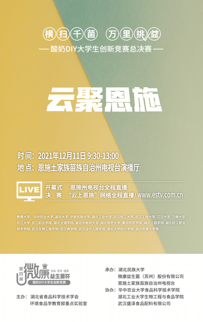 大赛海报由湖北省食品科学技术学会和环境食品学教育部重点实验室主办,我校承办的以“横扫千菌,万里挑益”为主题的酸奶DIY大学生创新竞赛总决赛,将于12月11日在恩施电视台演播厅举办,有包括我校、华中农业大学、湖北大学、中南民族大学等在内的20余所高校参赛。根据疫情防控要求,本次决赛采取团队代表线上答辩进行,届时,开幕式由恩施州电视台进行现场电视直播,同步“云上恩施”网络直播,决赛全程通过“云上恩施”网络直...