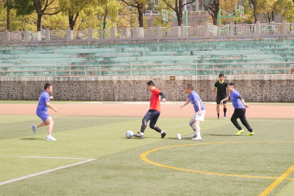 随着裁判哨声的响起,比赛正式拉开序幕。双方精神抖擞,迅速进入竞技状态。在球场上,他们盘带、短传、激烈拼抢,每一次的激烈对抗都点燃了现场的气氛,将比赛推向了高潮。特别是在下半场比赛中,双方比分胶着,比赛进入了激烈的白热化阶段。凭借丰富的比赛经验,教师们抓住每一个得分的机会,展开了精彩的对抗。场边的欢呼声和呐喊声此起彼伏,场面异常热烈。
