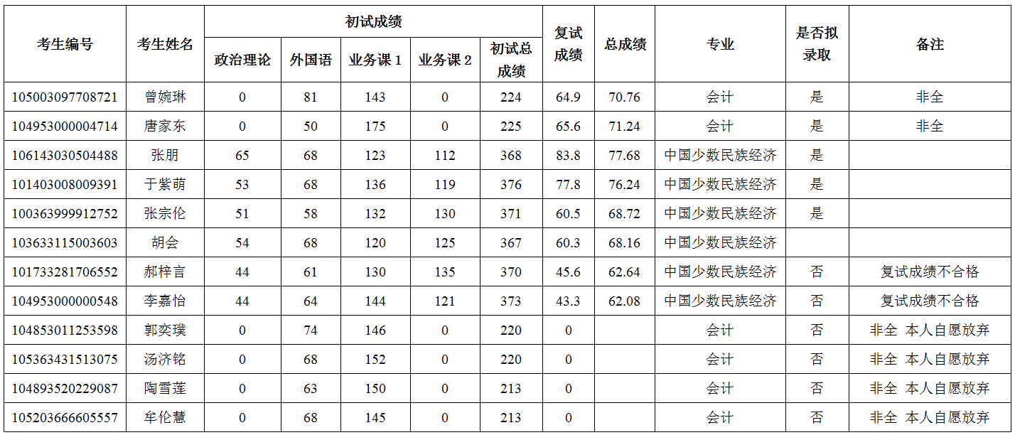 1. 总成绩计算办法:入学总成绩=(初试总成绩÷A)×60% +复试总成绩×40%(中国少数民族经济专业初试总分为500分时,A=5;会计专硕初试总分为300分时,A=3);