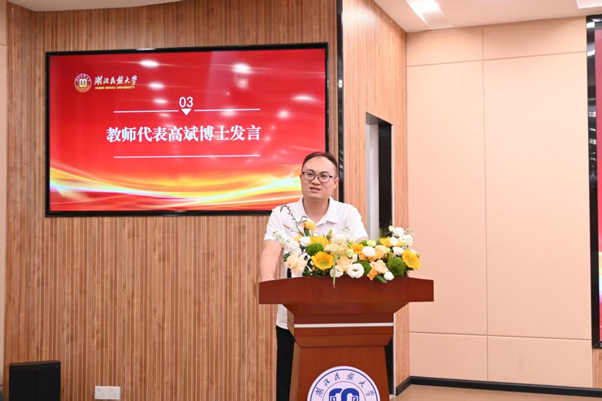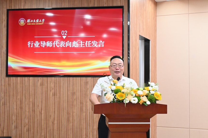 研究生行业导师、本科生行业导师代表,恩施市教学研究和教师培训中心主任向彪上台发言,对新生提出三点期望:一是胸怀家国,立“教育强国、育才报国”志向,担师范教育使命,融个人追求于民族复兴;二是脚踏实地,练“学高为师、身正为范”能力,扎实掌握素养与技能,顺应时代要求;三是坚韧前行,铸“破茧成蝶、久久为功”精神,以终身学习应对挑战,实现人生价值。发言最后,向彪主任即兴赋诗一首:“欣逢金秋丹桂香,开学宣誓铸梦想。良好风貌慨而慷,展望未来今胜昔。宜将精力继学习,不要辜负好时光。师生携手齐努力,共襄民大新辉煌”,为新生送上美好祝福。