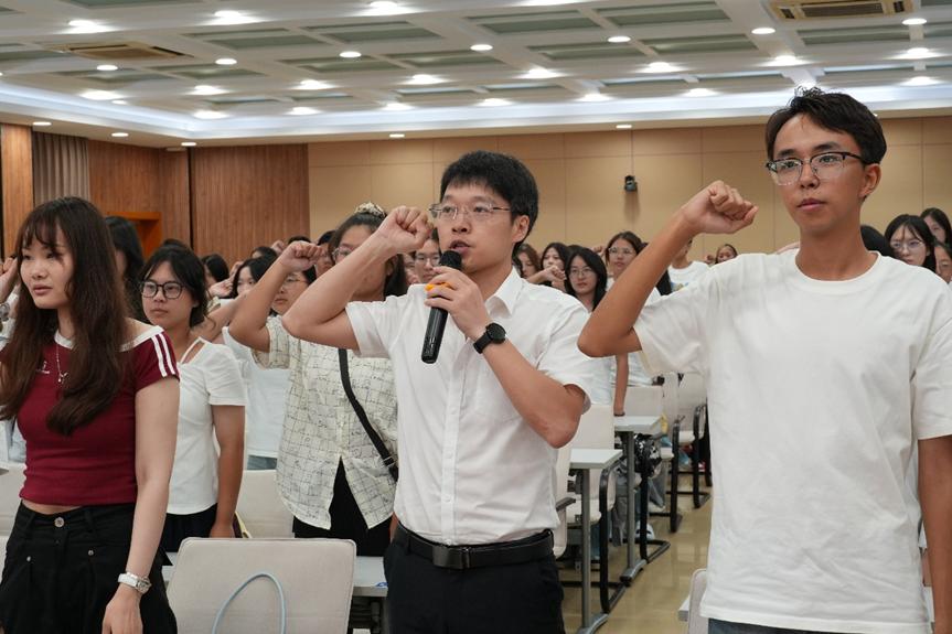 最后,教师教育学院小教系负责人周向伟博士带领小学教育专业新生及研究生进行师范生宣誓。“为教育强国、民族复兴而努力奋斗!”的铮铮誓言,既是新一代师范生对教育事业的赤诚承诺,也是他们践行使命的坚定宣言。