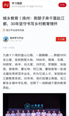 《城乡教育丨扬州:荆楚子弟千里赴江都,30年坚守书写乡村教育情怀》《视频丨乡音“已”改鬓毛衰,这群湖北老师来到扬州近30年,“扎根”偏远乡村无悔无怨》…近日,学习强国、扬子晚报等中央及江苏省主流媒体,先后对我校11位1996届师范专业校友扎根扬州江都偏远乡村教育,30年无悔无怨的敬业奉献故事进行了深度报道。