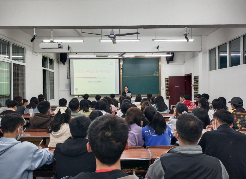 本网讯(记者 尚者 李雨洁/文 尚者 李雨洁/摄)10月30日晚,我院在3204教室进行党史教育,主题为“中国共产党的性质与指导思想”。学生第一党支部书记黄丽娜老师担任主讲人,2022级统计专业全体学生到场聆听。