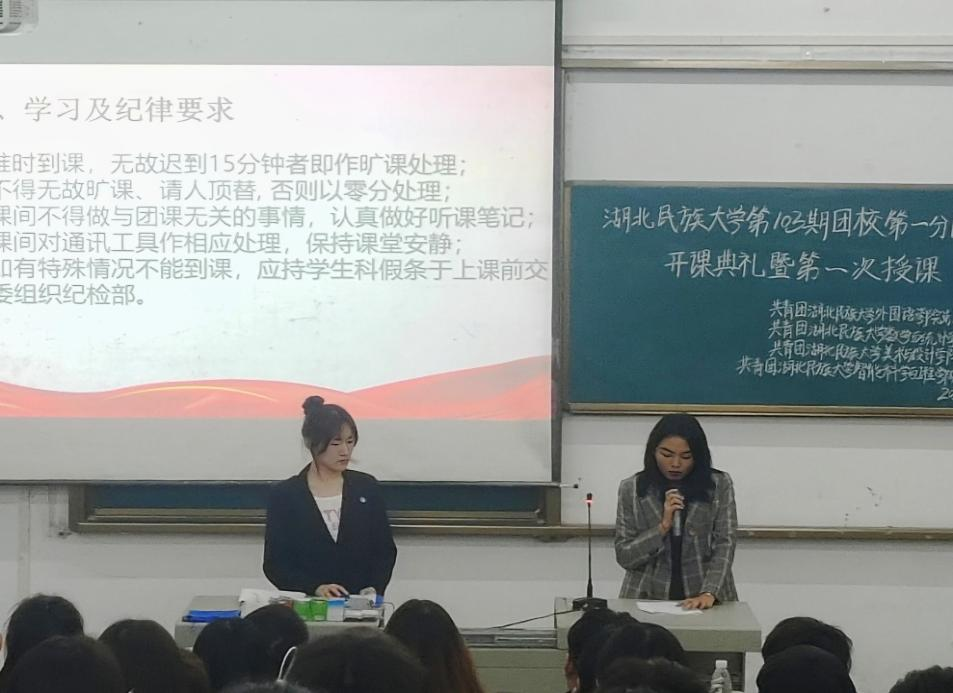 提升共青团员思想理论水平和政治素质,进一步增强广大学生的团员意识,加强团员队伍建设。雷竞技raybet登录入口第103期团校第一分团校开班仪式于2024年4月9日晚在数学与统计学院开展。数学与统计学院团总支书记刘聪,外国语学院团总支书记周婷出席本次开课典礼。数学与统计学院、外国语学院、美术与设计学院、智能科学与工程学院团校成员到场聆听。