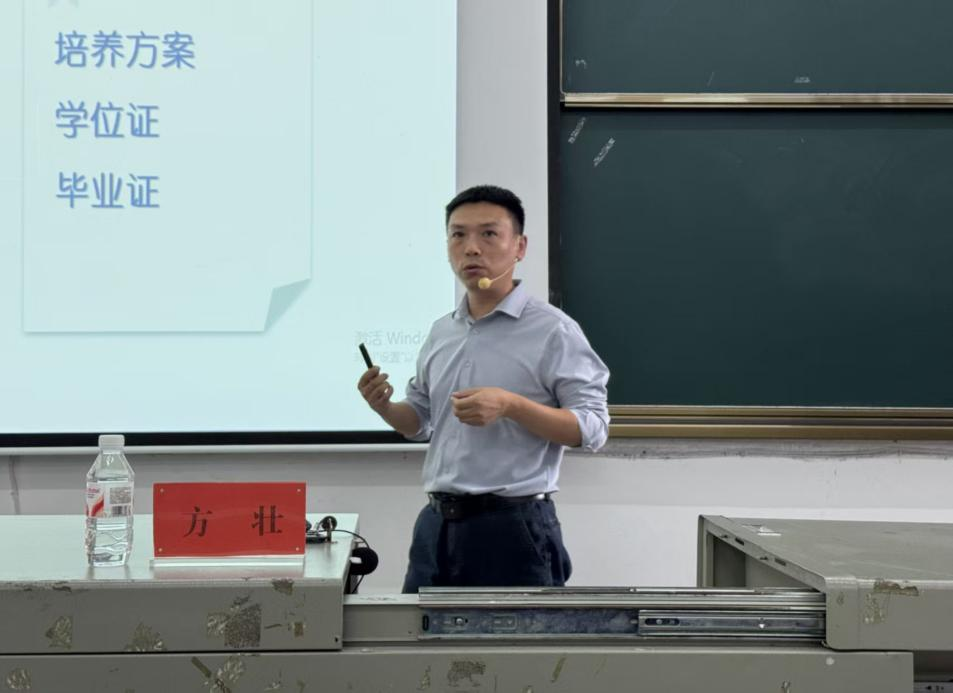 为帮助2025级新生全面了解学院教学管理规定,尽快适应大学学习生活,明确学业规划及发展方向。9月28日下午,学院在3308教室举办新生教学管理制度专题讲座。本次讲座由学院党总支委员、副院长方壮主讲,2025级全体新生参加。