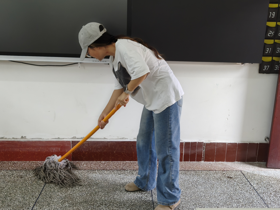 活动中,同学们分工明确、干劲十足。大家从教室内部的桌面、黑板,到走廊的宣传栏、墙角等公共区域进行了全面清扫,用实际行动为学院环境"焕新颜"。