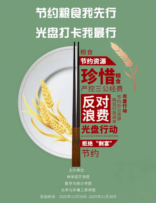 为弘扬勤俭节约的传统美德,营造崇尚节约、反对浪费的校园氛围,11月24日至11月28日,数学与统计学院联合林学园艺学院、化学与环境工程学院开展主题为“节约粮食我先行,光盘打卡我最行”光盘打卡活动,本次活动面向全体在校学生。