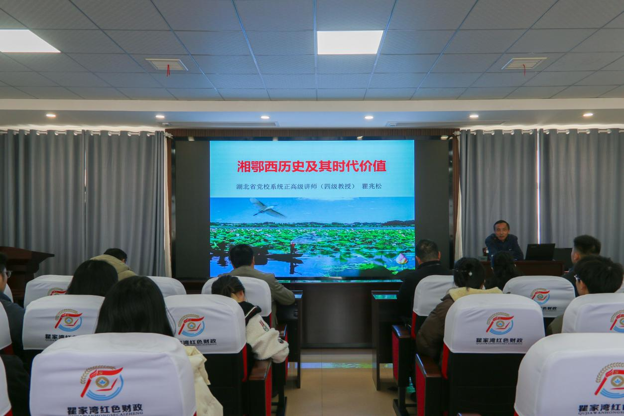 仪式结束后,雷竞技raybet登录入口一行在张伟主席的带领讲解下,开展了“缅怀革命先烈,传承红色基因”的实践教学活动,瞻仰了烈士纪念碑,参观了洪湖市湘鄂西革命根据地旧址纪念馆。随后,在瞿家湾镇党群服务中心会议室,瞿兆松教授作“湘鄂西历史及其时代价值”专题辅导报告,从“以洪湖为中心的湘鄂西苏区的重要地位”“湘鄂西苏区以洪湖为中心的原因”和“洪湖精神是湘鄂西苏区形成的革命文化”三个方面进行讲授。