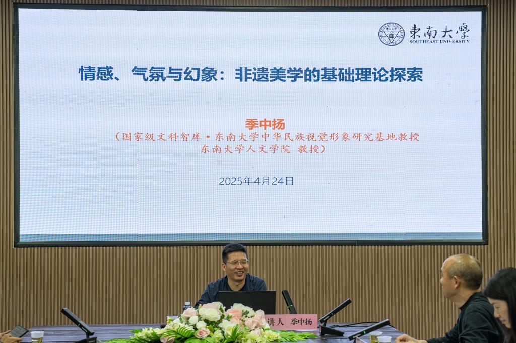 2025 年 4 月 24 日晚,民族学与社会学学院与我院共同邀请东南大学中华民族视觉形象研究基地专家、博士生导师季中扬教授,在12B501多功能教室举办“情感、气氛与幻象:非遗美学的基础理论探索”为主题的讲座,民族学与社会学学院与我院研究生、部分教师和本科生参与讲座和讨论。讲座由我院院长石庆秘教授主持。