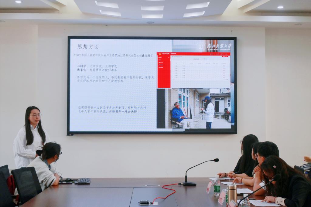 答辩现场,文学与传媒学院的邵泉智从思想、学习、工作等方面展开阐述,他认真学习党的先进思想,时刻以党员的标准要求自己,同时身为班委的他,将“高标准、严要求”作为自己的座右铭,在学习和生活中充分发挥学生干部的榜样作用;外国语学院的孙宇晗秉持矢志创新的精神,在创新创业方面多次获得校级金奖及银奖,平时积极参与志愿服务活动,以饱满的热情在社会中奉献自己,志愿服务时长高达277.77小时;民族学与社会学学院的段明丹将“青春之路,逐梦前行”作为主题展开论述,她认真参与“三会两制一课”的课程,积极向党组织靠拢,同时她成绩优异,曾连续两年获得国家励志奖学金。