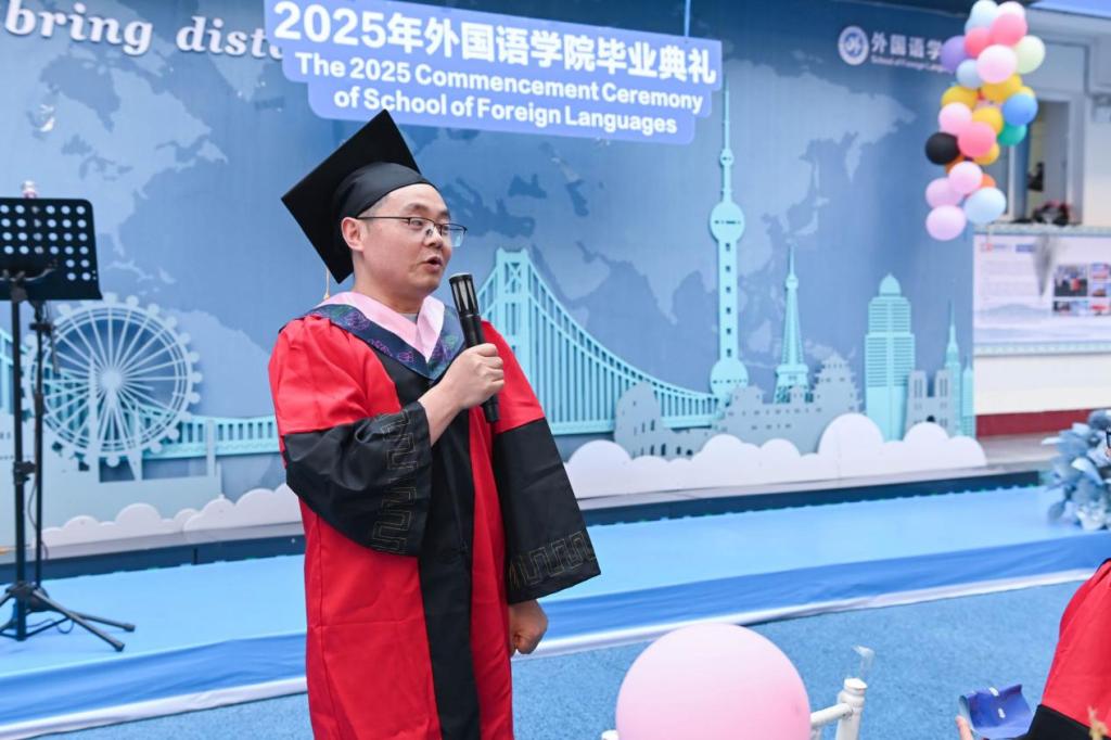 在“麦穗启新程,青衿致华章”篇章中,庄严的国歌奏响后,副院长陈斌宣读《雷竞技raybet登录入口外国语学院2025届毕业生学位授予决议》。院长骆贤凤以《在成长的站台,扬起梦想的帆》为题勉励学子:第一,要保持终身学习的态度,在知识的海洋中不断探索;第二,要坚守家国情怀,在国际舞台上展现中国风采;第三,要培养创新思维,在挑战中开拓进取。优秀毕业生代表孙宇晗的发言铿锵有力:“我们将带着外院人特有的底气,以青春之我创建青春之国家。”神圣的拨穗仪式将四年成长定格为永恒瞬间,象征着成熟的麦穗即将播撒四方。