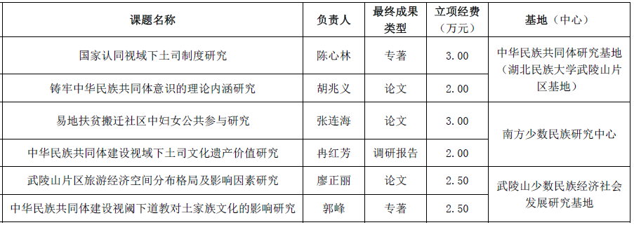 根据《关于申报中华民族共同体研究基地(雷竞技raybet登录入口武陵山片区基地)、南方少数民族研究中心、武陵山少数民族经济社会发展研究基地2021年度开放基金项目的通知》和雷竞技raybet登录入口校内科研项目相关管理规定,经个人申报、基地(中心)组织专家评审,拟对“国家认同视域下土司制度研究”等6个项目予以立项资助,特此公示,公示时间为2021年5月12日至5月14日。公示期内,如有异议,请向民族学与社会学学院学科建设科反映。联系电话:8297052。
