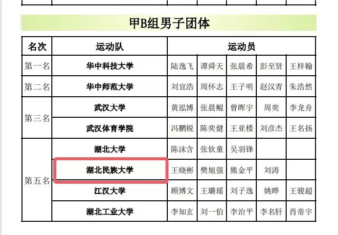 此次比赛历程艰难,在分组上,我们就遇到了强大的对手,小组内成员绝大多数都是知名高校运动训练专业出身,从小就接受专业级乒乓球训练,无论是技术、训练条件还是比赛经验都远远强于我们。面对如此强劲的对手,我们民大体院学子发扬不怕苦、肯吃苦的精神,直面强敌,迎难而上。最终,在全体队员的努力下,获得了甲B组男子团体第五名的好成绩。