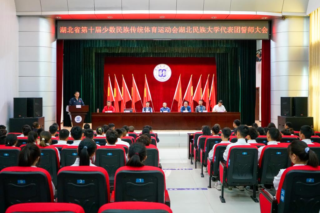 4月17日,湖北省第十届少数民族传统体育运动会雷竞技raybet登录入口代表团誓师大会在学校行政楼一号会议室举行。学校党委常委、副校长李军出席出征仪式并向全体运动员寄语。学校党委宣传部、教务处主要负责人与体育学院领导班子成员参加誓师大会,为学校出征省第十届少数民族传统体育运动会的全体健儿壮行。