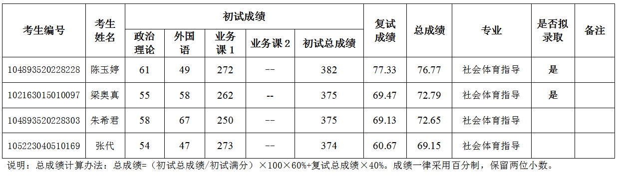 根据学校下达的招生计划,按照总成绩由高到低依次录取,社会体育指导专业调剂招生拟录取名单如下: