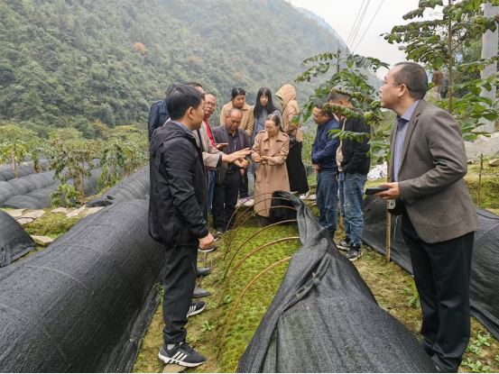 调研组在五谷坪中药材种植基地考察五倍子人工培育种植。五倍子是一味收涩药,主要由五倍子蚜寄生而形成。大家现场查勘了苗圃基地和种植基地,针对蚜虫的习性和培养进行了深入探讨。