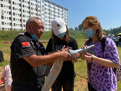 此外,他引用北京某宿舍起火的真实案例,具体分析造成火灾的原因,并向学生介绍常见的消防安全设施。他凭借简单的口诀“提、拔、握、压”,即“提起灭火器,右手握压把,左手托底部,到达现场,拔下保险栓,右手握压把,左手握喷管,喷管对准火焰根部,用力压下压拔,喷射火焰”来讲解灭火器的使用方法及作用,引导学生正确使用灭火器进行灭火。深入浅出、通俗易懂的讲解引得学生认真聆听。