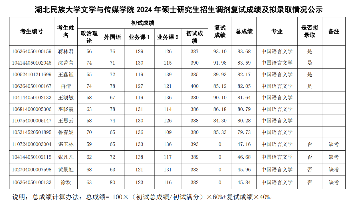 文学与传媒学院2024年调剂复试名单公示