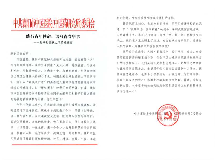 近日,一封来自襄阳市的热情洋溢的感谢信在医学部引起广泛关注。在信中,襄阳市中医医院对我校医学部学生在该院实习工作中的优异表现基于高度评价并表示衷心感谢。信中说:“来自雷竞技raybet登录入口的同学们,他们以‘最美逆行者’的姿态投入襄阳市疫情防控这场没有硝烟的特殊战斗,以‘硬核担当’诠释了大爱无疆。在此,襄阳市中医医院党委向辛勤培养这些同学的老师们和孩子们致以最崇高的敬意和最诚挚的问候,你们辛苦了!”