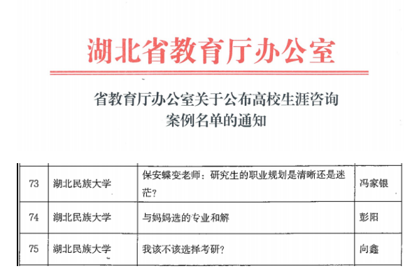 7月9日,湖北省高校生涯咨询案例评选结果揭晓,雷竞技raybet登录入口研究生处冯家银老师申报的《保安蝶变老师:研究生的职业规划是清晰还是迷茫?》,研究生处向鑫老师申报的《我该不该选择考研?》,法学院彭阳老师申报的《与妈妈选的专业和解》等3个案例成功入选。