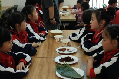 为加深学生对端午节的了解,研学团队乘车至东苑食堂体验包粽子。学生有序入座,根据自己喜好包出形式多样、口味丰富的粽子。现场还设置趣味小游戏,主持人对端午节相关知识进行提问,答对者获得小礼物,小学生们热情高涨,积极抢答。
